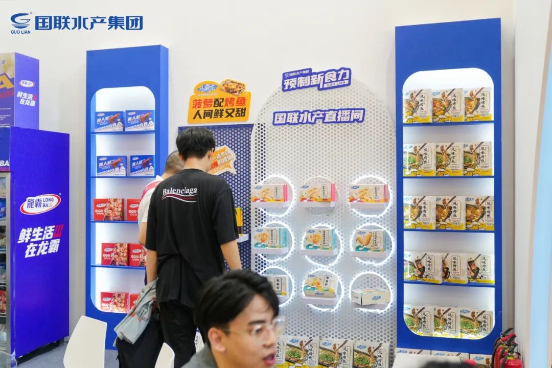 展會上,國聯水產集團展位在延續升級獨具一格的“國聯藍”的基礎上,巧妙融入龍霸、小霸龍兩大品牌視覺設計,以多重消費場景為靈感,聚焦八大超人氣預制菜,并特設品牌專區陳列,搭建靈活時尚的活動走線,讓所有前來的參觀者都能感受到國聯水產集團在萬億級預制菜賽道的“新食力”和領軍未來的決心!展位前人頭攢動,贊美、咨詢聲不絕于耳。