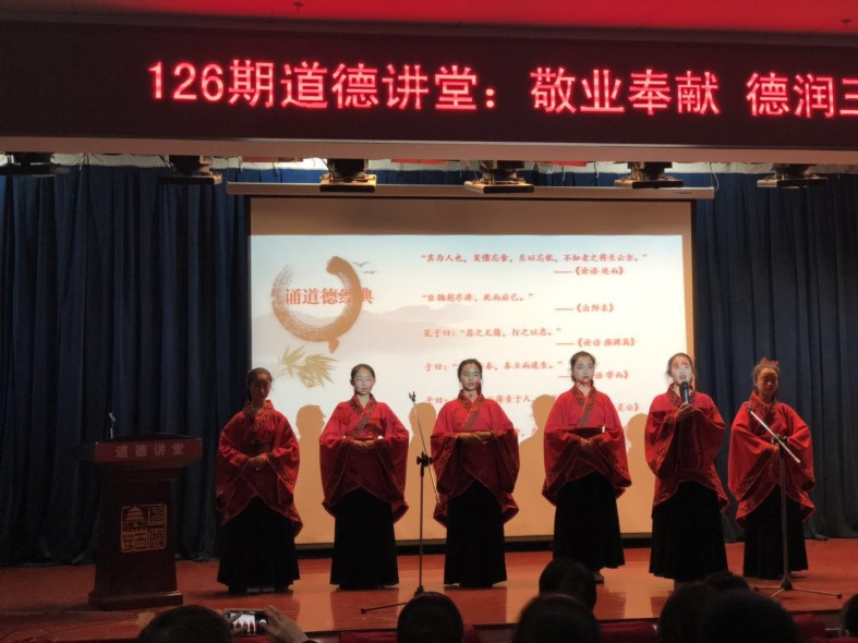 “其为人也,发愤忘食,乐以忘忧,不知老之将至云尔”,“臣鞠躬尽瘁,死而后已”学生代表朗诵的道德经典也再次说明爱岗敬业精神从古至今一直为人们所崇尚。