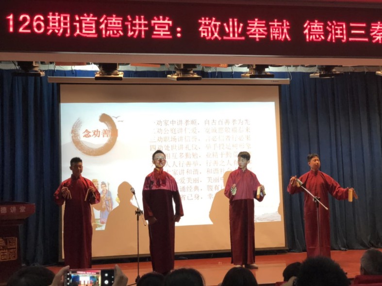 此次讲堂共有五个环节,围绕“敬业奉献,德润三秦”,这一主题,以唱《公民道德歌》、讲道德故事、诵道德经典、念劝善词、做道德承诺等形式开展。每个环节的内容都丰富多彩,引人深省,让大家受益匪浅。