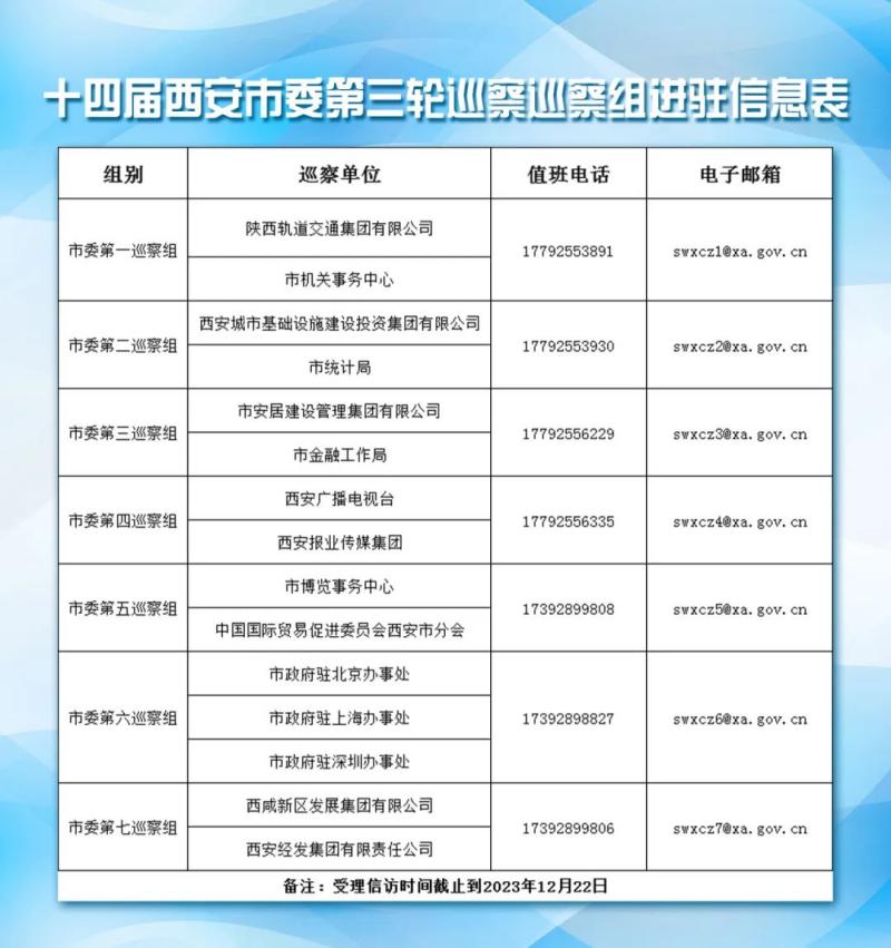经市委批准,十四届市委第三轮巡察共成立7个巡察组,分别对陕西轨道交通集团有限公司、市统计局、市金融工作局、市机关事务中心、市博览事务中心、西安报业传媒集团、西安广播电视台、中国国际贸易促进委员会西安市分会、西安城市基础设施建设投资集团有限公司、市安居建设管理集团有限公司、市政府驻北京办事处、市政府驻上海办事处、市政府驻深圳办事处等13家单位开展常规巡察,对西咸新区发展集团有限公司、西安经发集团有限责任公司2家单位开展提级巡察。